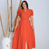 - Modelagem acinturada com saia ampla e abertura frontal